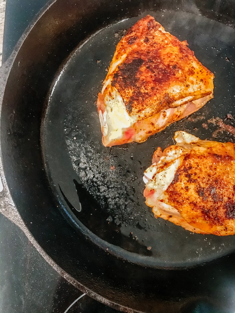 - Season chicken on both sides with paprika, salt, and pepper. Put paprika directly on skin of the chicken