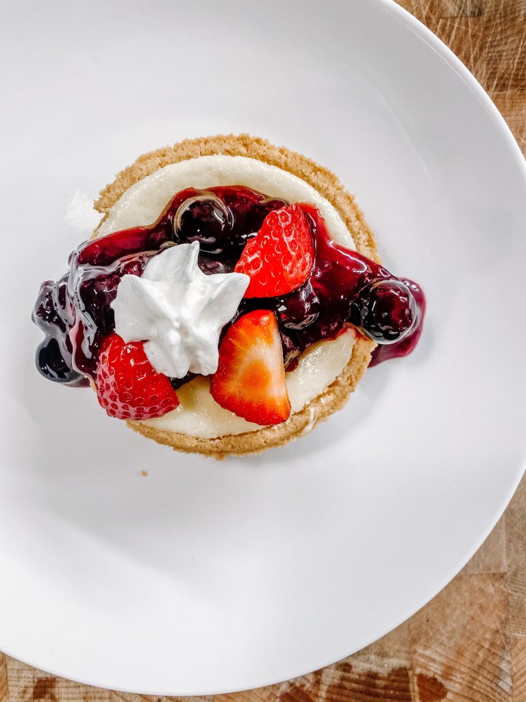 Pre-made graham cracker crust. Four-ingredient cheesecake. Simple blueberry reduction. What could be better?? For real. I had in my brain that cheesecake was hard and then I got the urge to make them tonight and it took 30 minutes in total. Now, if you have the time, home make your crust, but tonight, I was all about easy and they were fantastic.